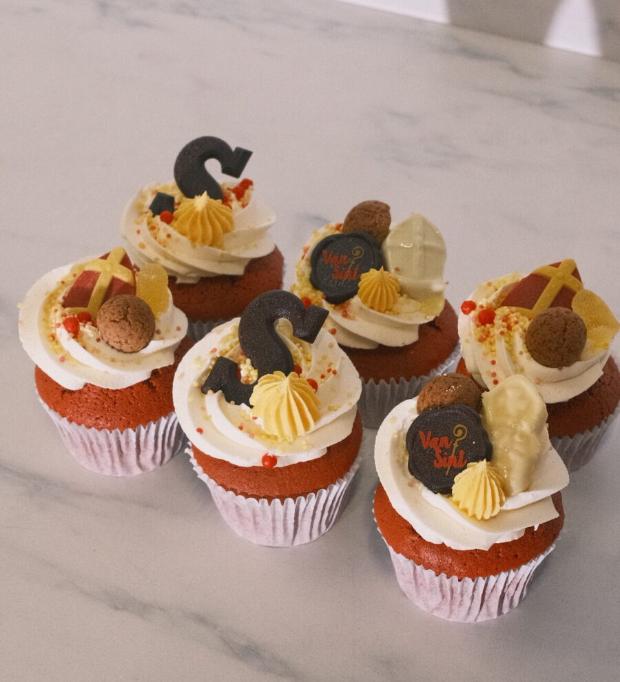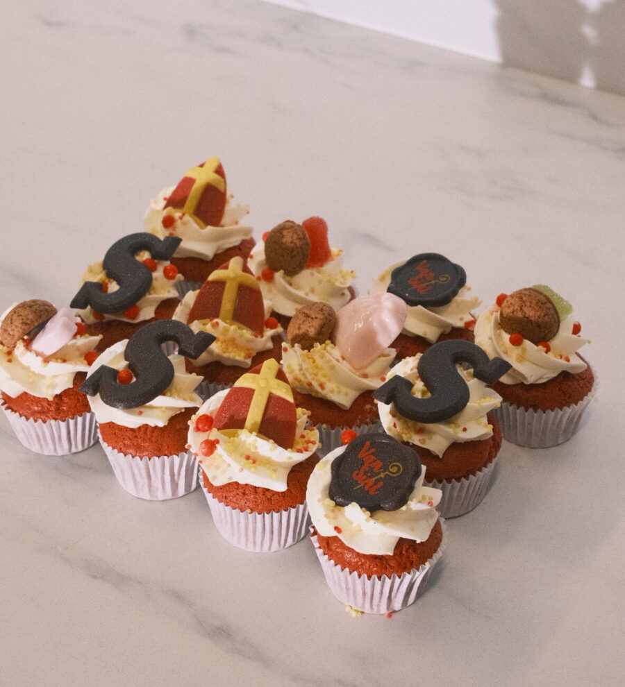 Smeuïg en onweerstaanbaar lekker! Onze Sint Cupcakes zijn gemaakt van fluweelzachte red velvet cake, royaal opgemaakt in een feestelijk Sinterklaas thema en afgewerkt met heerlijke chocolade.